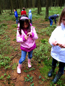 J’ai surtout aimé la promenade dans la forêt. Chemin faisant, j’ai découvert plein de choses intéressantes. J’ai vu un nid de fourmis. J’ai fabriqué un parfum en coupant en deux une pomme de pin, en y plaçant de la mousse, des fleurs et des feuilles que j’ai écrasées. J’ai appris à écouter et à dessiner les bruits de la nature. J’ai eu les yeux voilés et j’ai conduit ma classe le long d’un itinéraire limité par une corde.
