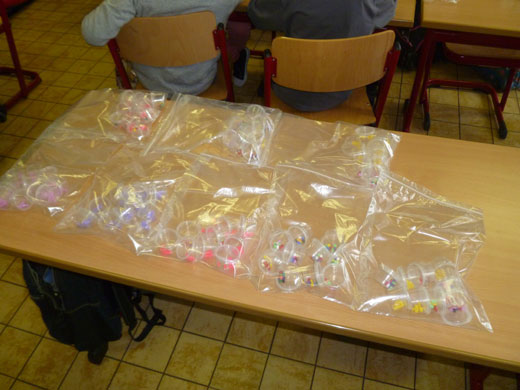 Madame nous a donc donné du matériel supplémentaire pour nous aider : des petits pots avec des couvercles, des sachets et des caisses.