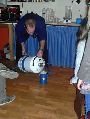 Une fois arrivés, nous avons participé à une expérience sur l’électricité. Nous avons appris que nous avons des électrons dans nos cheveux et que quand il y a un orage, il faut se mettre en boule. Ensuite, plusieurs élèves sont allés dans la cage de Faraday. Notre guide, avec un bâtonnet de cuivre, tapait sur la cage et il y avait des étincelles. La deuxième partie des expériences était sur l’azote liquide. Là, nous avons appris que dès que l’azote touche le sol, il devient du gaz.