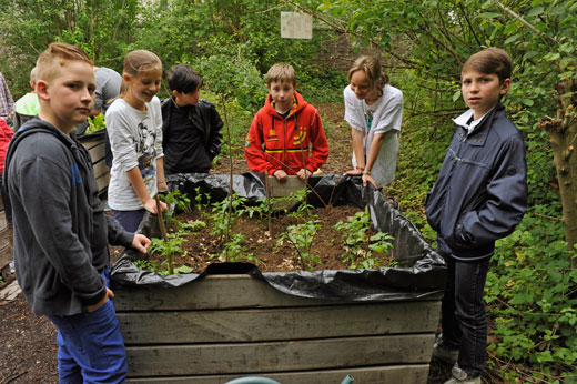 Nous nous retrouvons sur le site. On est armé de sécateurs et on divise notre classe en quatre groupes : deux sur le terrain de tennis dévasté par la nature et deux autres groupes qui vont déblayer l’ancien chemin pour rendre l’accès à notre potager plus facile.