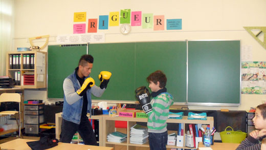Deux élèves de notre classe font de la boxe. C’est pour cela que nous l’avions invité. Nous avions préparé une série de questions que nous souhaitions lui poser. Il y a répondu avec plaisir. Plus il parlait, plus nous avions de nouvelles questions qui nous venaient en tête.