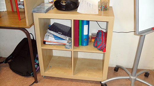 Pour commencer, dans notre local, nous n’avons pas de mallettes dans nos pieds pour nous embêter. Nos cartables se cachent sous notre « bulle ».