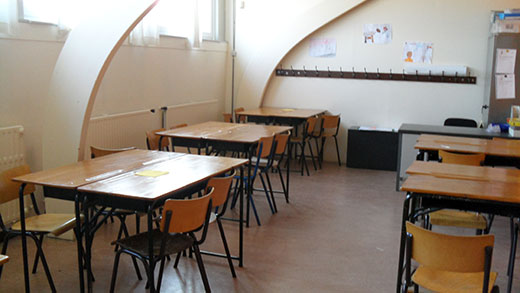 Nous disposons aussi d’un autre local, juste en face de notre classe. Ce local que nous nommons « local groupe » nous permet, forcément de travailler en groupe, mais aussi de confronter notre travail ou de travailler en ateliers le lundi avec Monsieur Locht. Ce local nous sert aussi de réfectoire sur le temps de midi. Il est même équipé d’un four micro-onde qui nous permet de manger les restes du souper de la veille. Parfois la file est fort longue.