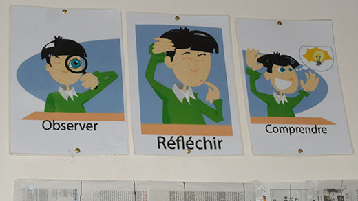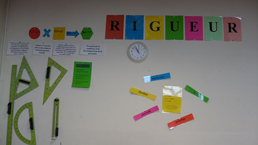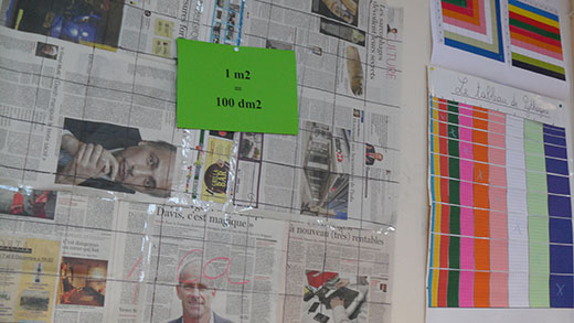 Il y a des affichages pour les matières vues (le m², le tableau de Pythagore, les homonymes… ) ; pour la méthode de travail (« Observer, réfléchir, Comprendre, » ; «rigueur » ; …) et pour nous aider dans notre comportement (« famille ronde et école carrée » ; convivialité ; …).