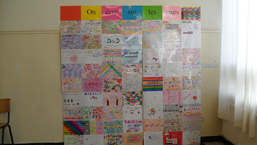Nous avons étudié et chanté la chanson « On écrit sur les murs » interprétée par les « Kids United ». L’idée est alors née de représenter, sur des feuilles de papier, une partie d’un mur. Chaque élève a alors décoré sa feuille en la coloriant et en y laissant un message d’espoir comme l’explique la chanson. Nous avons ensuite collé toutes ces feuilles ensemble pour former ainsi un grand mur coloré et rempli de nos différents messages.