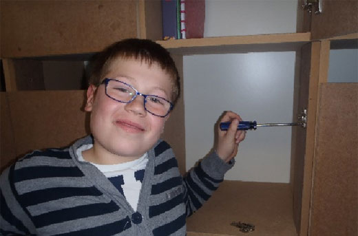 Alors, pour calculer où visser les séparations, nous avons utilisé une matière que nous devions voir en mathématiques : les intervalles. Mais, dans ce cas, la théorie ne se rapprocha pas de la pratique. Nous avions bien calculé nos intervalles et nous avions tracé sur le bois les emplacements des séparations des casiers. Mais au moment de préforer et de visser, nous avons eu quelques surprises. Plusieurs casiers avaient des mesures différentes. Force fut de constater que notre armoire allait devenir une œuvre unique et originale ;o)
