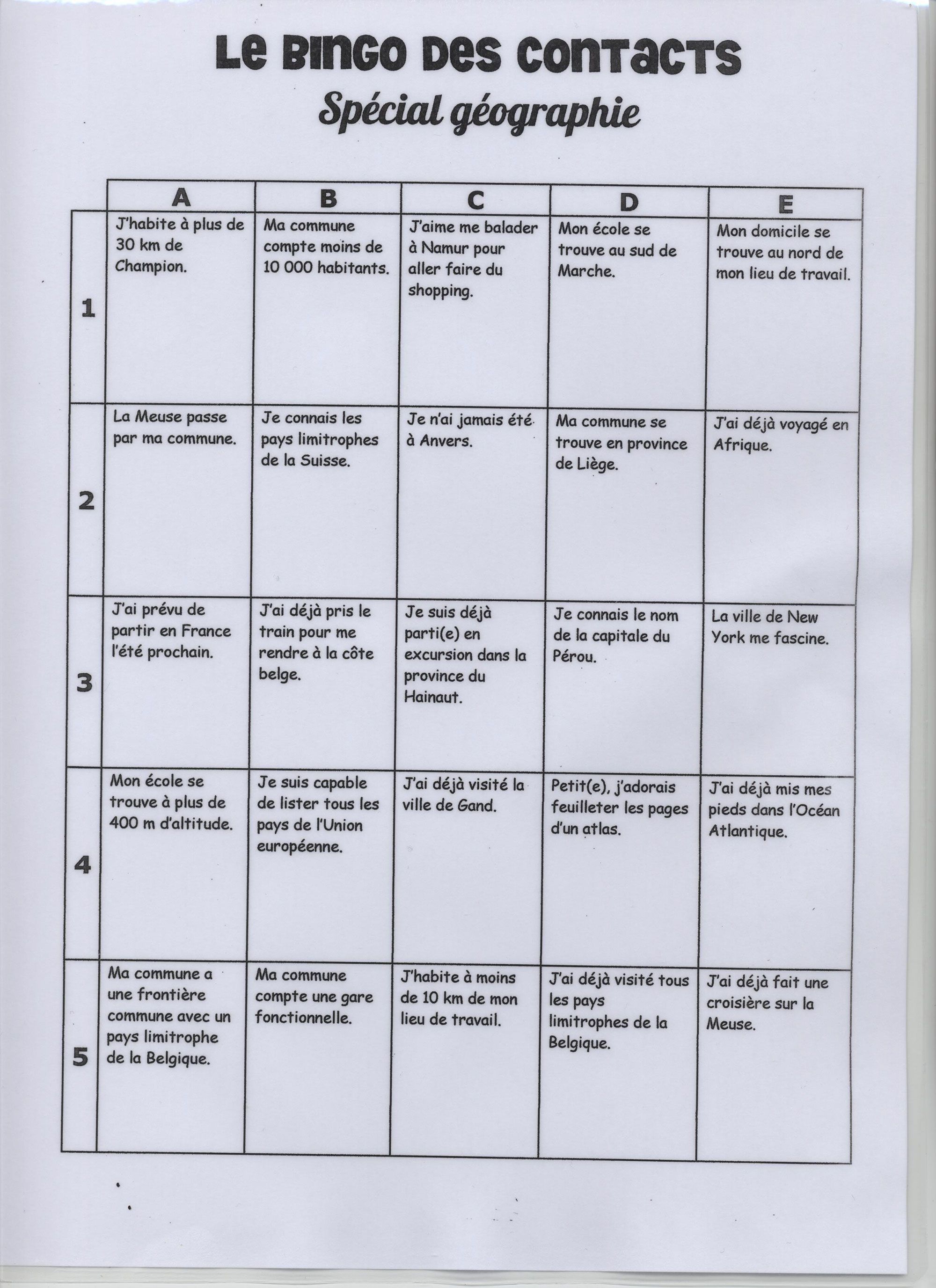 • Pour obtenir une signature, on va à la rencontre des autres participants et on leur pose une question qui se trouve sur la feuille (ex. pour la E2 : es-tu déjà allé en Afrique ? »). Si la réponse est positive, la personne qui a répondu positivement signe dans la case concernée (dans ce cas-ci la case E2).