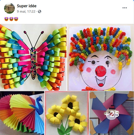 Ce lundi, nous vous proposons une activité bricolage. Il ne vous faudra que de la colle, des ciseaux et des feuilles blanches et colorées.