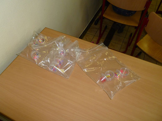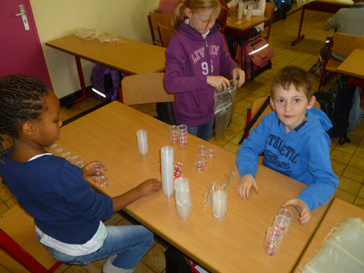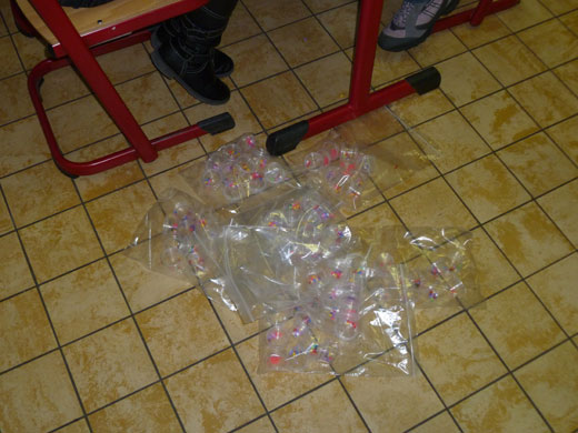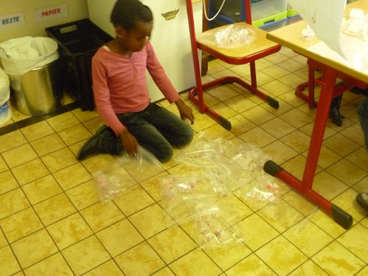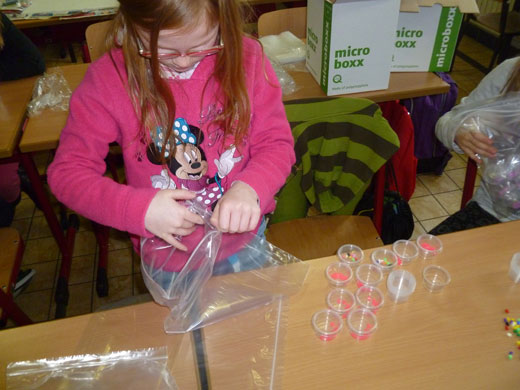 Madame nous a donc donné du matériel supplémentaire pour nous aider : des petits pots avec des couvercles, des sachets et des caisses.