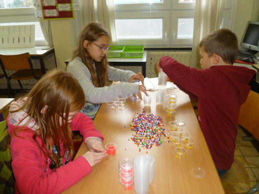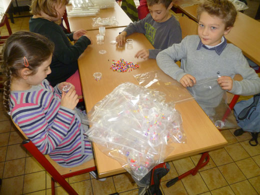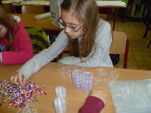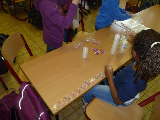 Nous avons regroupé les perles par 10 et les avons mises dans les petits pots fermés. Lorsque nous avions 10 petits pots fermés, nous les placions dans un sachet. Enfin, lorsque nous avions 10 sachets, nous les placions dans une caisse.