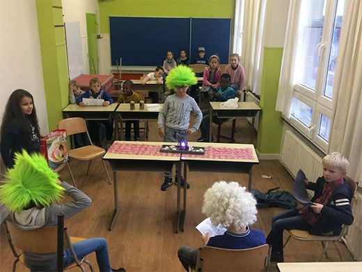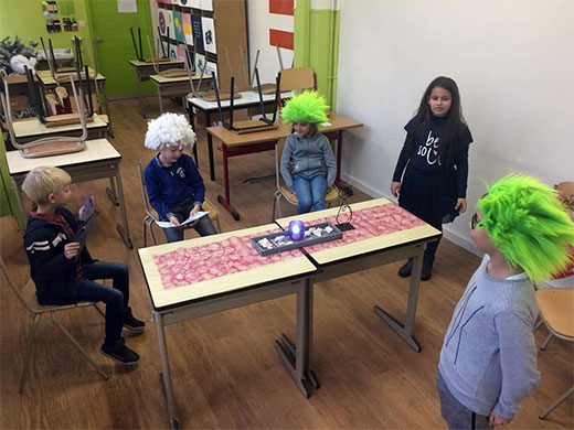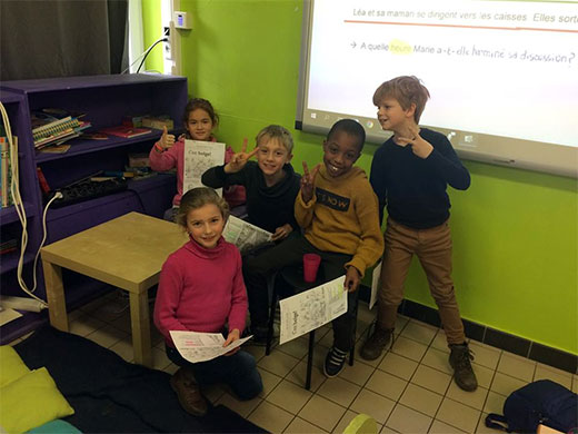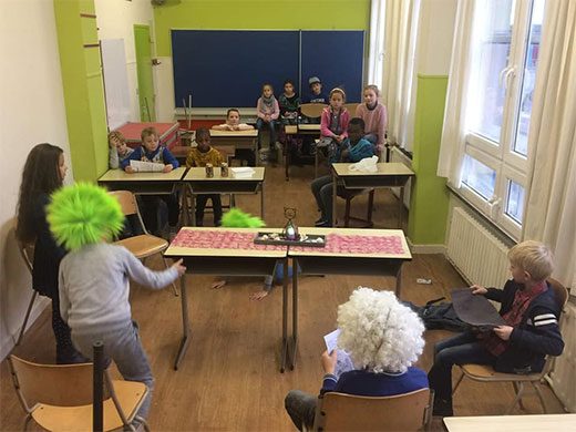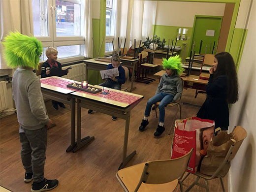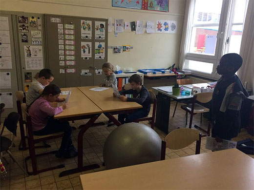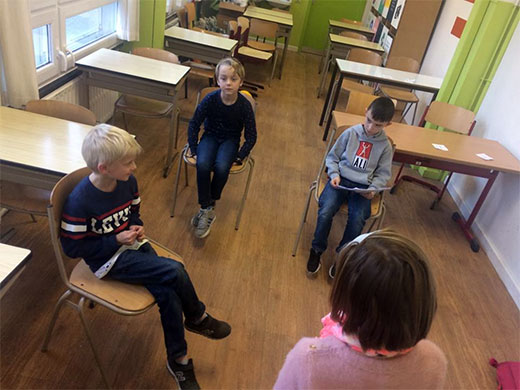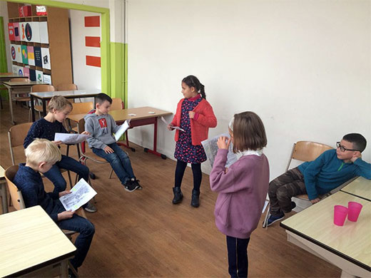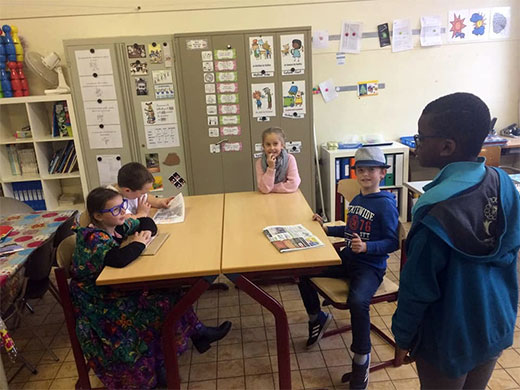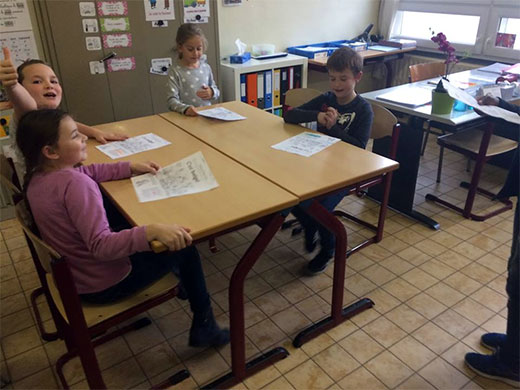 Cette semaine, les élèves de 3e se sont lancés dans l'apprentissage d'une petite pièce de théâtre. Lors de la première leçon, il a fallu découvrir le scénario, répartir les rôles, apprendre à lire le texte avec expression... et ce n'était déjà pas une mince affaire. Le deuxième jour, les petits comédiens ont entrepris la mémorisation des dialogues, l'adoption d'une attitude liée à son personnage, la mise en scène, les accessoires... Quelle évolution en 2 jours ! Et ce n'est pas fini,il restera les décors,les costumes...