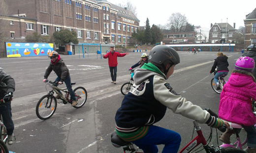 Durant tout ce temps, nous étions beaucoup avec les élèves de 5e B. Nous étions partagés en deux groupes, un travaillait en classe pendant que l'autre roulait. Après avoir réalisé différents exercices dans la cour, nous sommes partis essayer sur la route. La première fois, nous avons découvert le trajet et ses points dangereux. Les autres fois, nous avons fait des exercices où nous devions tourner bien large, faire attention dans un carrefour, etc. Et quand tout cela fut fini, nous avons pu passer notre brevet vélo.