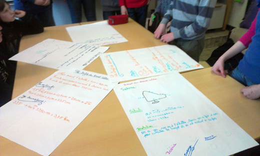 Nous l'avons recherché par groupe de six sur une carte de Visé. Pour cela, nous avons reçu des photos numérotées de 1 à 11 que nous avons remises dans le bon ordre. Ensuite, par groupe de quatre, nous avons calculé le nombre de kilomètres du trajet. Pour y arriver, nous avons utilisé l'échelle des cartes. Nous étions tous d'accord pour dire qu'il mesurait 3,4 km. Le lundi, nous avons calculé la vitesse à laquelle nous avions réalisé le trajet le vendredi. Mais avant de la trouver, nous sommes allés dans la cour pour courir 100 mètres. Nous étions par groupe de trois: un courait, un chronométrait et le dernier notait. Puis nous avons découvert le calcul de la vitesse horaire.