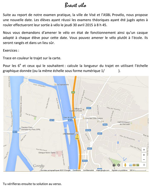 Nous sommes sortis environ quatre fois pour nous entrainer à passer le brevet vélo. Nous avons fait le tour de Visé, plus particulièrement de Devant-le-Pont, à vélo. Les premières fois, nous avons fait du vélo avec Monsieur Charlier et Madame Malderez. Ils nous expliquaient les règles à respecter pour notre sécurité. Le dernier lundi, nous sommes sortis avec un moniteur qui remplaçait Monsieur Charlier.