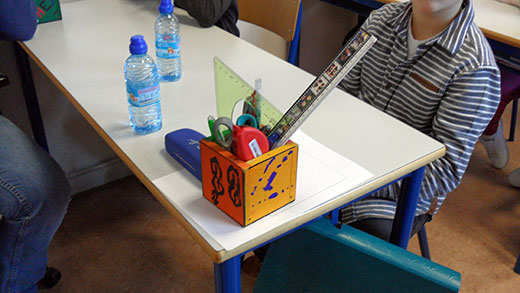 Comme notre sac n’est pas tout près de nous, nous disposons d’un casier, d’une cassette et d’une « boite plumier » dans lesquelles nous devons tous les jours tout ranger. La « boite plumier » (que nous avons décorée en début d’année) doit ne contenir que le strict nécessaire : bic quatre couleurs, stylo, efface encre, crayon, gomme, surligneur, marqueur effaçable et latte.