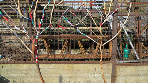 Une fois rentrés à l’école, nous avons accroché à l’aide de « colsons », dans ce qui deviendra un espace citoyen, nos différents bois décorés.