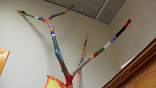 Pendant cette semaine, nous sommes allés dans le bois chercher chacun un branche qui nous plaisait. Nous avons laissé sécher notre branche ; puis, nous avons enroulé de la laine autour de notre bois afin de le décorer.