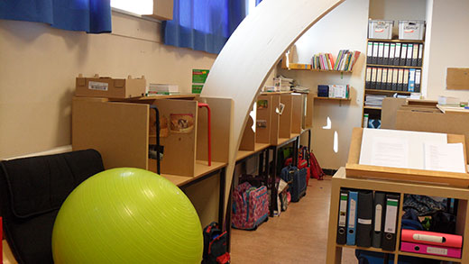 Pour commencer, dans notre local, nous n’avons pas de mallettes dans nos pieds pour nous embêter. Nos cartables se cachent sous notre « bulle ».