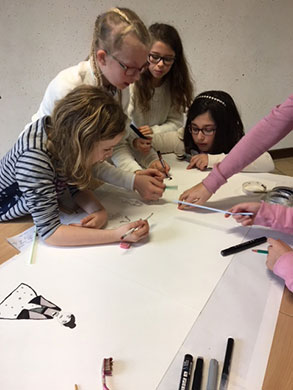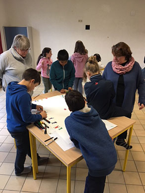Une fresque artistique : On a reçu une grande feuille, nous avons choisi les groupes. On nous a donné différents exemples de peinture. Nous avons dû nous inspirer de plusieurs artistes, tel que Pablo Picasso par exemple. Nous avons fait une pyramide avec des personnages de Keith Haring. Nous avons rigolé ensemble !