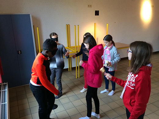 Le parcours aveugle : Nous avons formé des groupes de deux. Avec un bandeau sur les yeux, nous avons réalisé des bruits avec des instruments pour diriger l’autre vers le parcours. Il y avait des obstacles à passer en haut et en bas. Nous avons très bien travaillé en équipe.