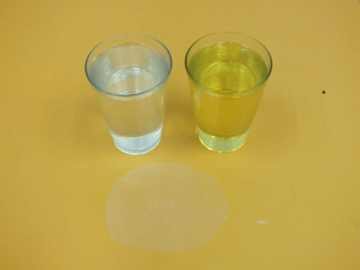Sur le verre rempli d'eau, il est écrit "huile"