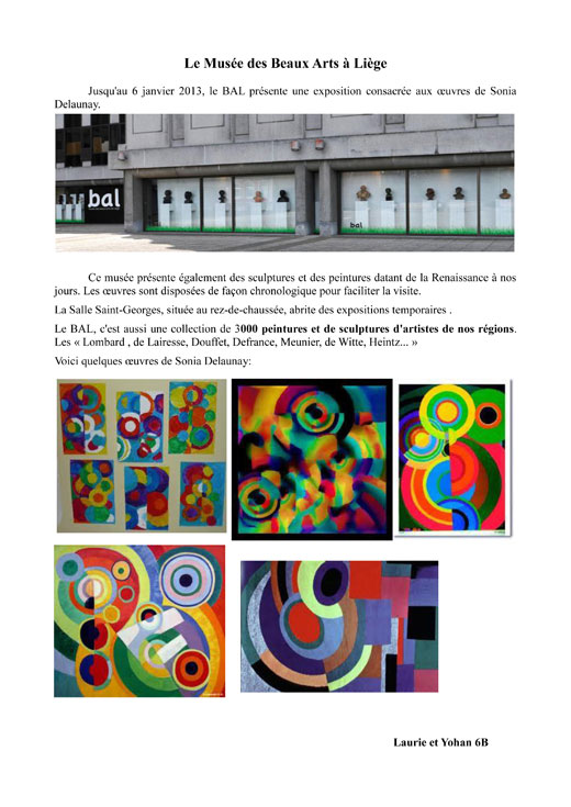 Celle-ci concernait Sonia Delaunay. Tout d'abord, nous avons regardé ses brouillons. Puis, la guide nous a expliqué le cercle chromatique des couleurs. Ensuite, nous avons créé nos propres brouillons comme Sonia. Une fois la visite terminée, nous sommes allés manger et jouer dehors. Après nous être bien dépensés, nous avons participé à un rallye photo dans les anciennes rues de Liège.