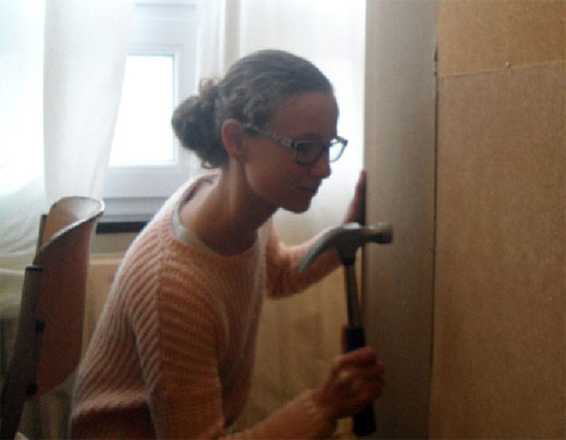 Monsieur Franssen, un menuisier professionnel s’est penché sur notre travail. Il nous a préparé le fond de notre armoire et cerise sur le gâteau, des portes pour nos casiers comme nous le souhaitions tant. Cet homme de métier très méticuleux a dû s’adapter à notre projet et a réussi à lui donner une image plus régulière. Grâce à son aide précieuse, nous avons pu forer avec une planche-guide, visser les charnières et assembler nos portes.