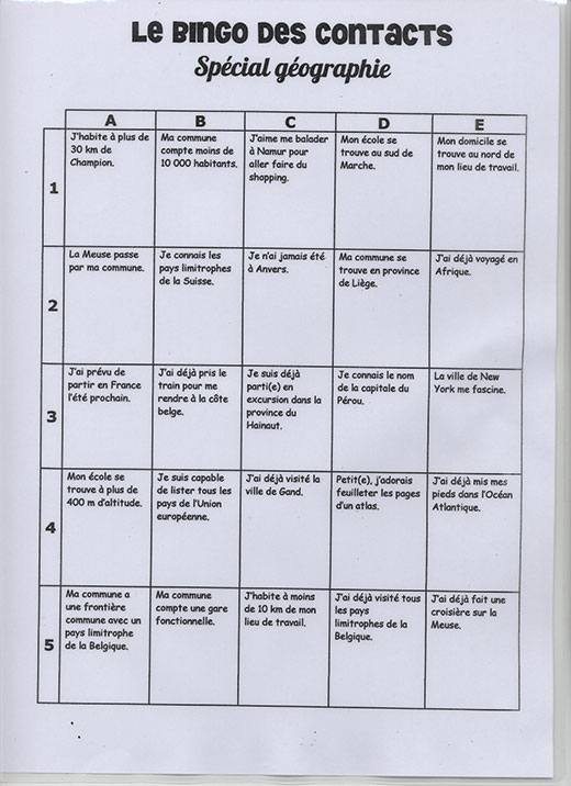• Pour obtenir une signature, on va à la rencontre des autres participants et on leur pose une question qui se trouve sur la feuille (ex. pour la E2 : es-tu déjà allé en Afrique ? »). Si la réponse est positive, la personne qui a répondu positivement signe dans la case concernée (dans ce cas-ci la case E2).