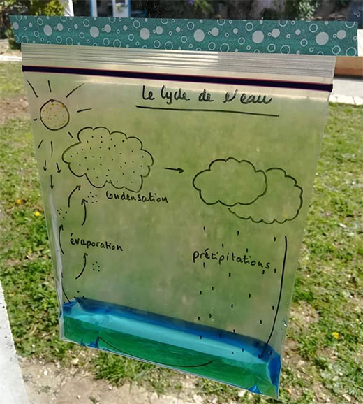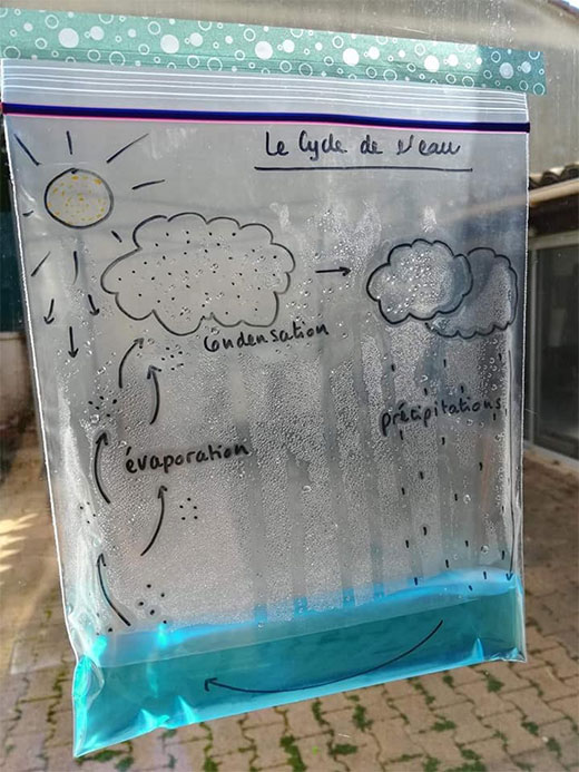 Au bout d’une heure environ, l’eau va s’évaporer et venir se condenser en petites gouttelettes sur les parois du sac. Quand les gouttelettes deviennent trop volumineuses (au bout de plusieurs heures), elles ruissellent le long des parois et retournent au fond du sac, il pleut !