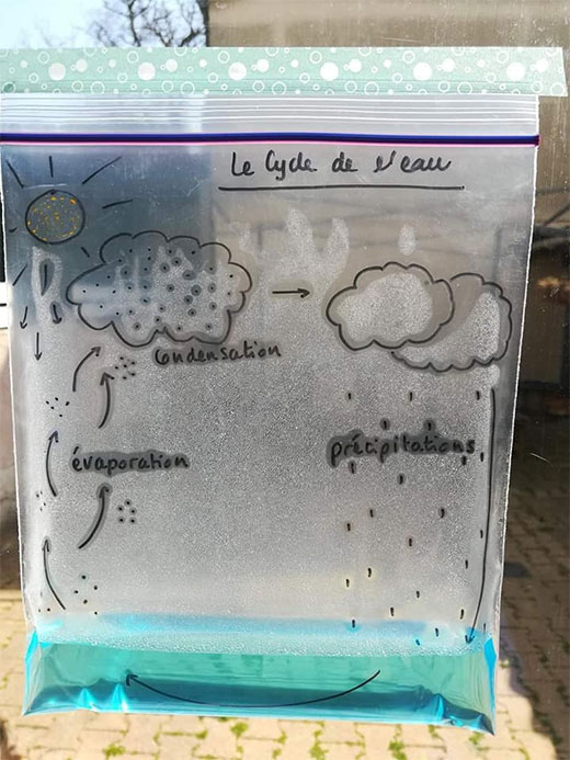Si vous avez fait chez vous l’expérience du nuage confiné, elle sera parfaite pour compléter et comprendre comment se fabrique la pluie et plus généralement le cycle de l’eau de façon ludique et très imagée.